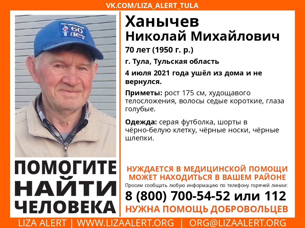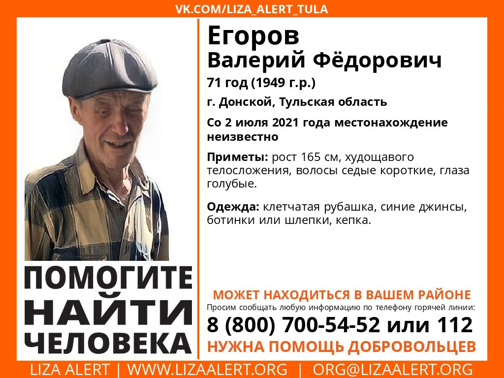 Поисковый отряд «ЛизаАлерт» ведет на территории Тульской области поиски двух пенсионеров. 71-летний Валерий Егоров пропал в Донском 2 июля, уже третий день его местонахождение неизвестно. Житель Тулы, 70-летний Николай Ханычев ушел из дома 4 июля и не вернулся.