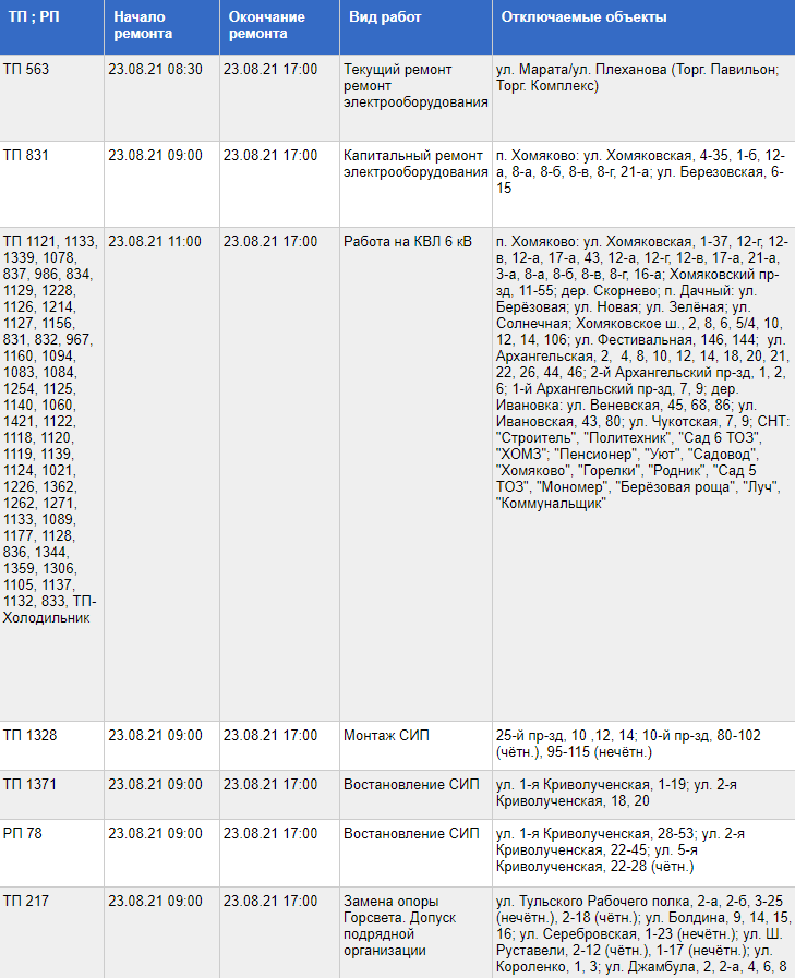 В понедельник, 23 августа из-за плановых работ часть жителей Тулы останется без электричества. Отключения в этот день связаны с ремонтом электрооборудования, а также работами по монтажу и восстановлению СИП, говорится на сайте «Тульских городских электрических сетей».