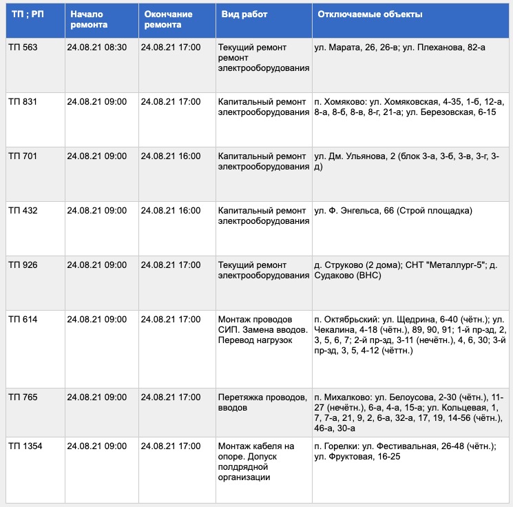 Кроме этого, во вторник частично обесточат поселки Хомяково, Октябрьский, Михалково, Горелки и деревня Струково Большая часть отключений продлится в течение рабочего дня.