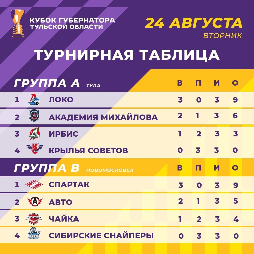 Теперь в полуфинал Кубка губернатора выходят четыре команды: Из группы «А» — «Локо» и «Академия Михайлова», из группы «Б» — «Спартак» и «Авто». Игры полуфинала состоятся уже 25 августа. Тульской «Академии Михайлова» предстоит сыграть в 19:00 с московской командой «Спартак» в тульском Ледовом дворце.