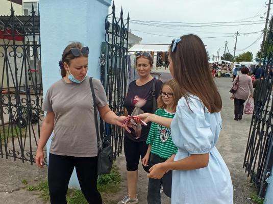 Акция проходила рядом с Суворовской ярмаркой на улице Грибоедова. А раздавали ленточки волонтеры из отряда «Доброе сердце».