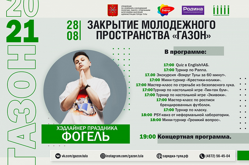 28 августа в Туле завершится проект «Газон». В субботу с 17 часов жителей областного центра ждет масштабная развлекательная программа — музыка, спортивные и танцевальные активности, интеллектуальные битвы.