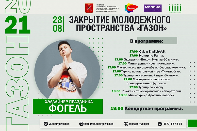 Туляков приглашают принять участие в спортивных и танцевальных активностях. В 19 часов на сцене начнется праздничный концерт, в рамках которого состоится выступление хедлайнера сегодняшнего вечера – известного российского певца Фогеля.