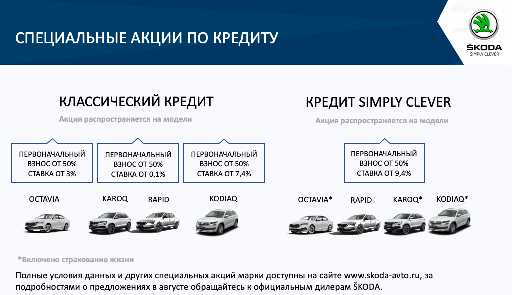 В августе также можно воспользоваться выгодными предложениями по классическому кредиту и кредиту SIMPLY CLEVER. Для клиентов, желающих приобрести модели RAPID или KAROQ в классический кредит, процентная ставка составит от 0,1% годовых при первоначальном взносе от 50%, для KODIAQ предусмотрена ставка от 7,4%, для новой OCTAVIA ставка начинается от 3%. Для всего модельного ряда чешского автопроизводителя по кредиту SIMPLY CLEVER предусматриваются ставки от 9,4%. Покупателям OCTAVIA доступна специальная акция с тарифом по страхованию КАСКО 2,8%, а для моделей SUV KAROQ и KODIAQ – 2,5%.