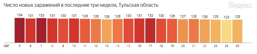 В регионе были подтверждены 10 летальных случаев среди зараженных пациентов. Для Тульской области это максимум с начала мая. В целом за время пандемии от осложнений, вызванных инфекцией, умерли 2 659 человек.