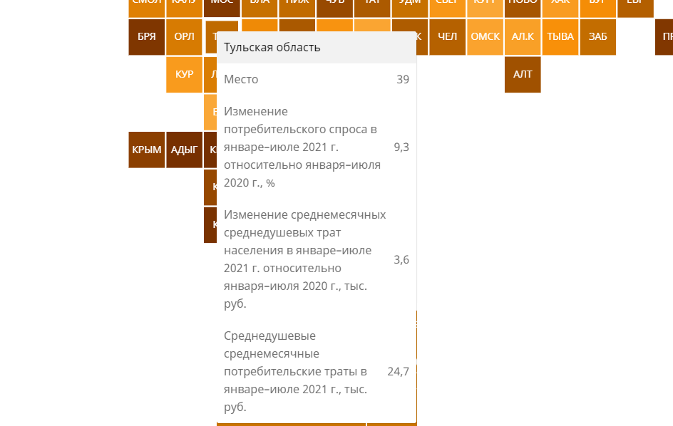 Средние ежемесячные потребительские траты (расходы на покупку товаров, услуг и общественное питание) жителей Тульской области в 2021 году оценили почти в 25 тыс. рублей. По данным РИА Новости, с января по июль 2021 года среднедушевые траты в тульском регионе составили 24,7 тыс. рублей. В целом, в сравнении с 2020 годом, потребительский спрос в Тульской области вырос на 9,3%, также увеличились и сами расходы — на 3,6%. В общем рейтинге регион занял 39-е место.