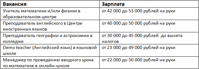 Так, самой высокооплачиваемой вакансией на удаленке является учитель математики и физики в образовательном центре. Работодатели готовы платить до 53 000 рублей в месяц. Преподаватель английского в Центре иностранных языков сможет зарабатывать до 50 000 рублей. До 49 000 рублей в месяц работодатели предлагают преподавателям географии и астрономии в колледже.