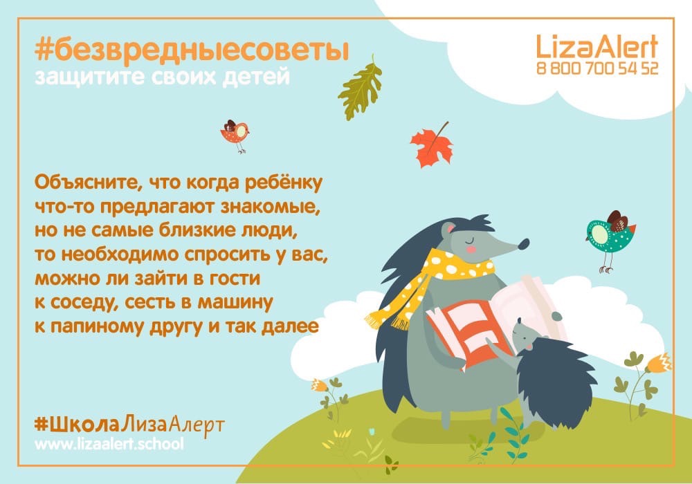 С детьми необходимо обсудить, как отказывать на обращения взрослых, также ребенка нужно убедить, что ругать за невежливый отказ его не будут. Волонтеры советуют отрепетировать фразы, например: «мама с папой не разрешают мне разговаривать с незнакомыми», «я не могу, извините», «я спешу». Также нужно проговорить, какие действия взрослых (прикосновения, поглаживания, объятья, поцелуи, проникновение в нижнее белье (кроме приема у врача с родителями) недопустимы.