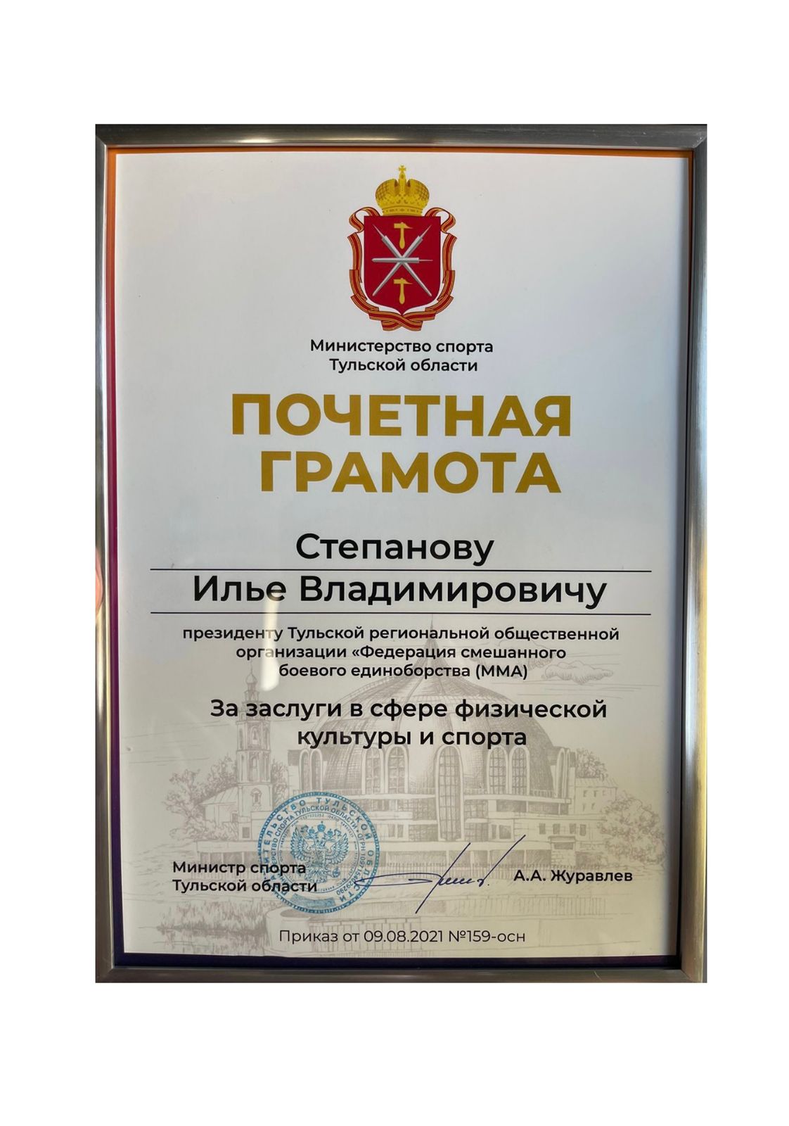 Депутат Тульской областной Думы, член фракции «Единая Россия», президент Тульской областной «Федерации смешанного боевого единоборства (ММА)» Илья Степанов награжден Почетной грамотой министерства спорта Тульской области, которую подписал глава регионального ведомства Андрей Журавлев.