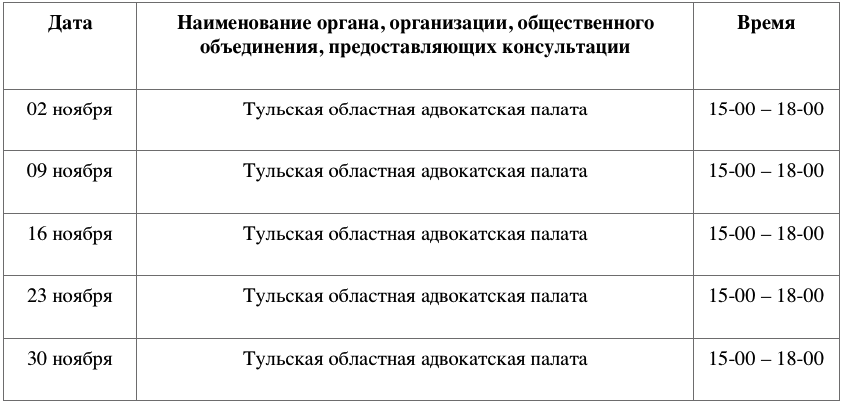 В ноябре сотрудники «Ассоциации юристов России» проведут консультации жителям Тулы и области. В плане пять таких консультаций со 2 по 30 ноября с 15 до 18 часов. Все юридические консультации будут организованы в приемной правительства Тульской области.