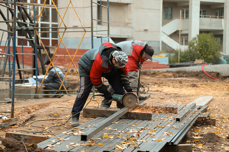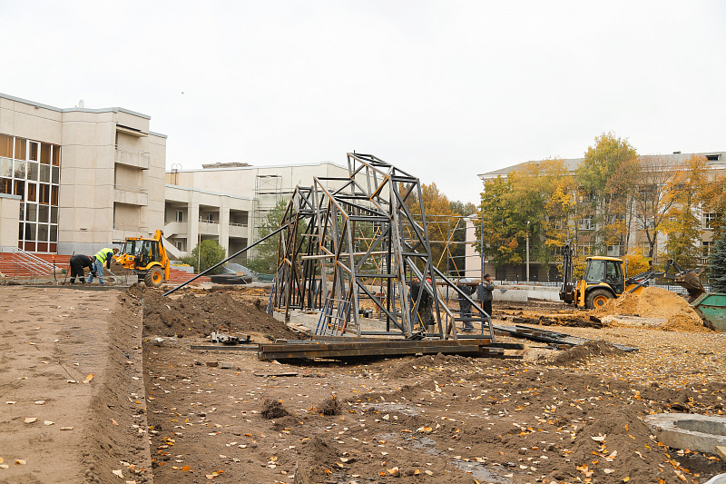 Сейчас рабочие монтируют каркас для мультимедийного экрана, а в ближайшее время — приступят к установке опор освещения. Одновременно с этим подрядчик закупает малые архитектурные формы.