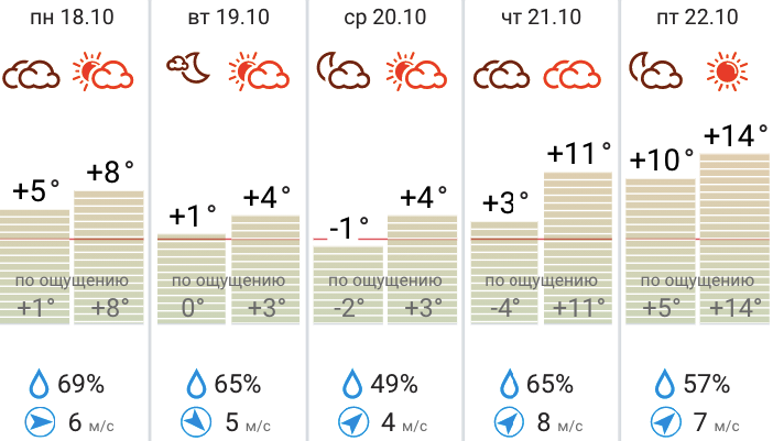 В недели в Туле похолодает +8…+4 градусов, возможны ночные заморозки. Самыми теплыми днями грядущей пятидневки станут четверг и пятница: 21 октября температура поднимется до +11 градусов, в пятницу — до +14 градусов. Кроме этого, в пятницу ожидается солнечная погода.