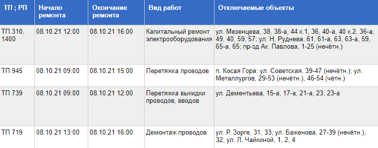 В Туле 8 октября пройдут плановые отключения электричества. Об этом сообщают Тульские городские электрические сети.