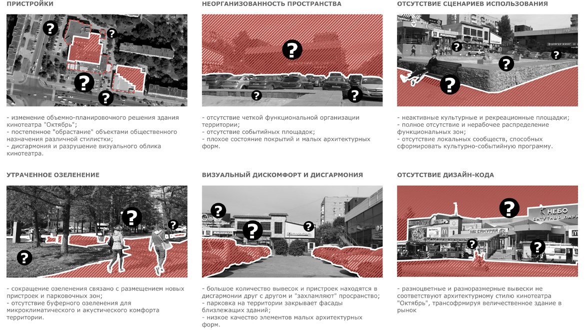 За основу проекта был взят расположенный рядом с общественным пространством бывший одноименный кинотеатр. Специалисты предлагают демонтировать пристройки и летние веранды, которые нарушают стилистику пространства: