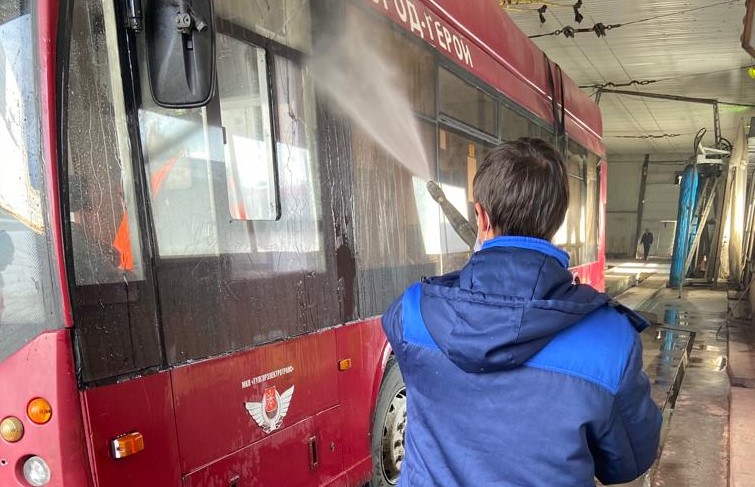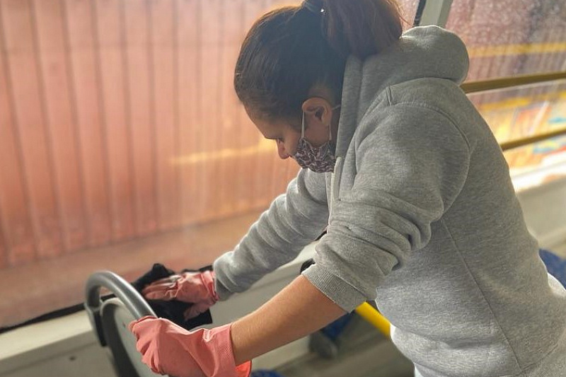 Весь транспорт, выходящий на линии, обеспечен дезинфицирующим средством: во время стоянки на водители проветривают и обрабатывают салон и кабину.