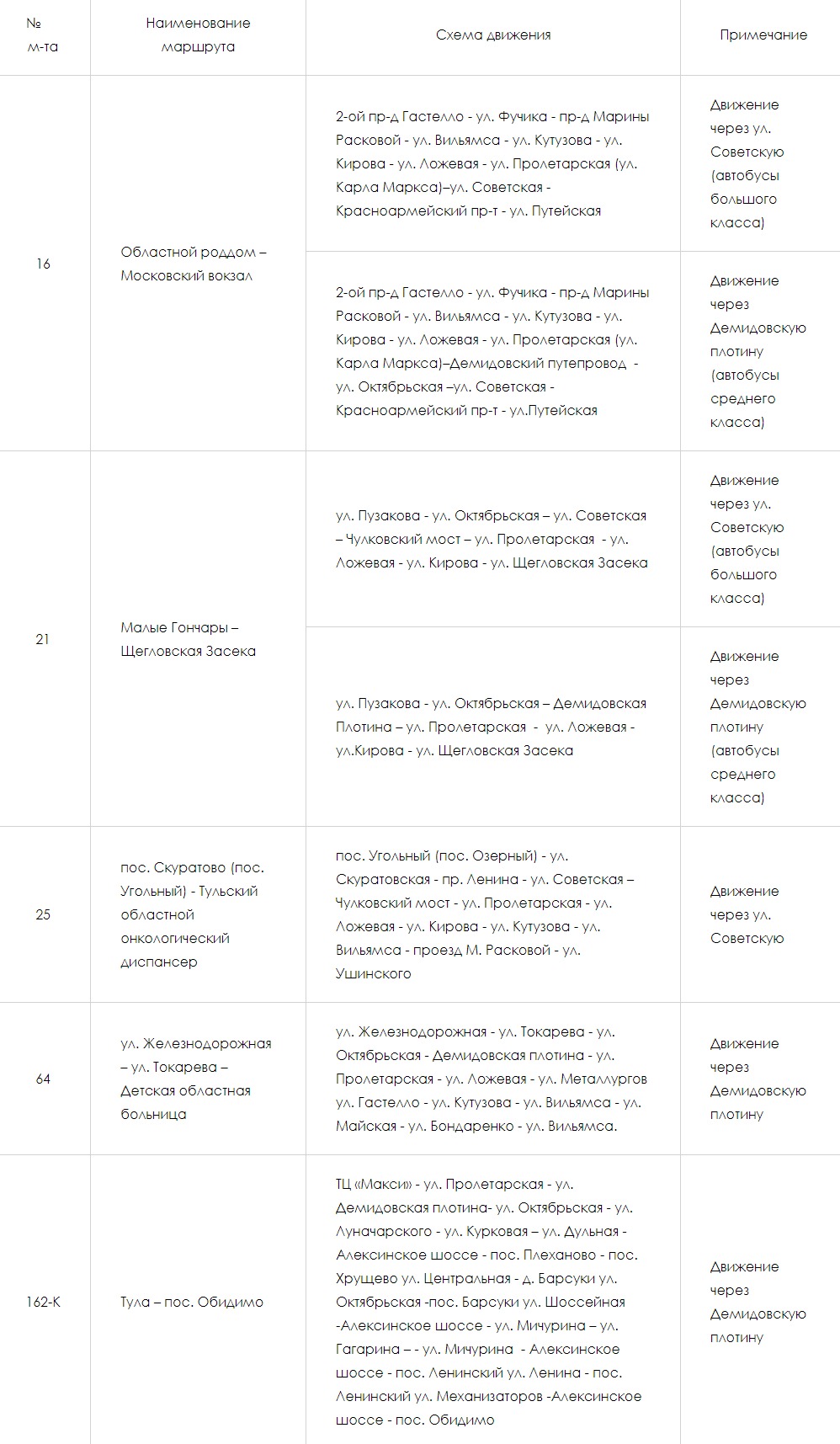 Автобусы большого класса маршрутов № 21 «Малые Гончары — Щегловская Засека» и № 25 «пос. Скуратово (пос. Угольный) — Тульский областной онкологический диспансер» будут осуществлять перевозки по измененной схеме с проездом через ул. Советскую, Чулковский мост и ул. Пролетарскую. Кроме этого, будут добавлены дополнительные автобусы среднего класса на маршруты №№ 21, 16 и № 162-К «Тула — пос. Обидимо». Движение автобусов маршрута № 64 «ул. Железнодорожная — ул. Токарева — Детская областная больница» будет осуществляться по установленной схеме без изменений.
