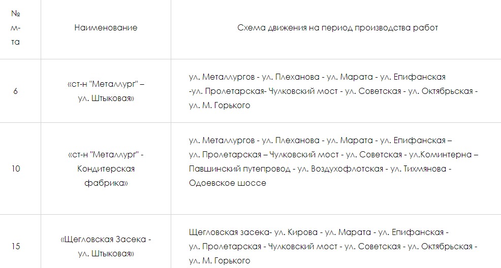 По данным администрации Тулы, автобусы большого класса маршрутов № 21 «Малые Гончары — Щегловская Засека» и № 25 «пос. Скуратово (пос. Угольный) — Тульский областной онкологический диспансер» будут осуществлять перевозки по измененной схеме с проездом через ул. Советскую, Чулковский мост и ул. Пролетарскую.