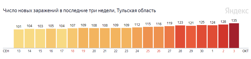 Федеральный оперштаб обновил статистику по коронавирусу в регионах России — и число заболевших продолжает расти. Так, в Тульской области за последние сутки выявлены 135 случаев заражения COVID-19 (это максимум за два месяца).