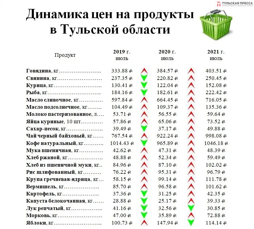 Напомним, в Тульской области отмечается рост стоимости почти всех продуктов основного спроса. В сравнении с 2020 годом в регионе подешевели только яблоки и репчатый лук. Сахар-песок же за год подорожал на 35%, подсолнечное масло — на 24%, рыба — на 21%.