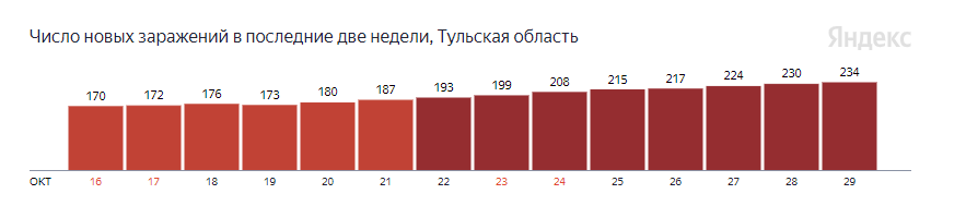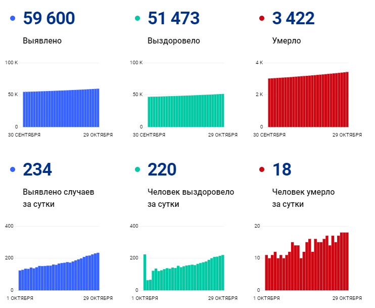 Всего с начала пандемии в Тульской области заболели 59 600 человек, а выздоровели — 51 473. Общее число умерших к 29 октября достигло 3 422.