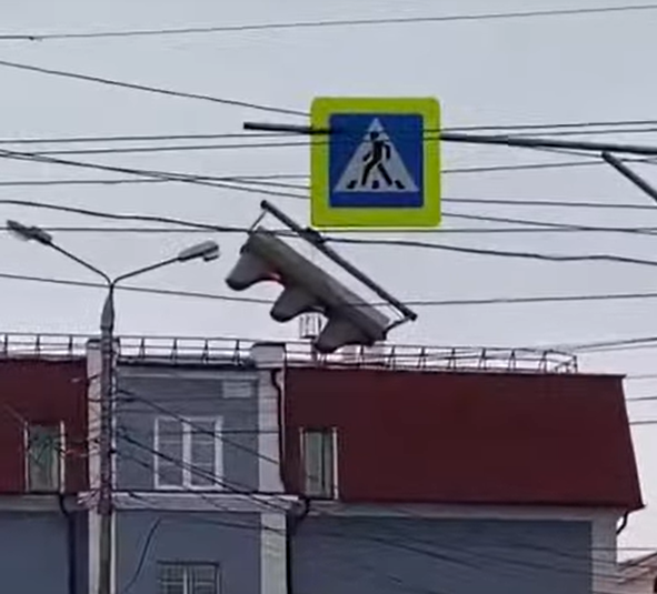 На улице Дмитрия Ульянова из-за сильного ветра на проводах повис светофор.