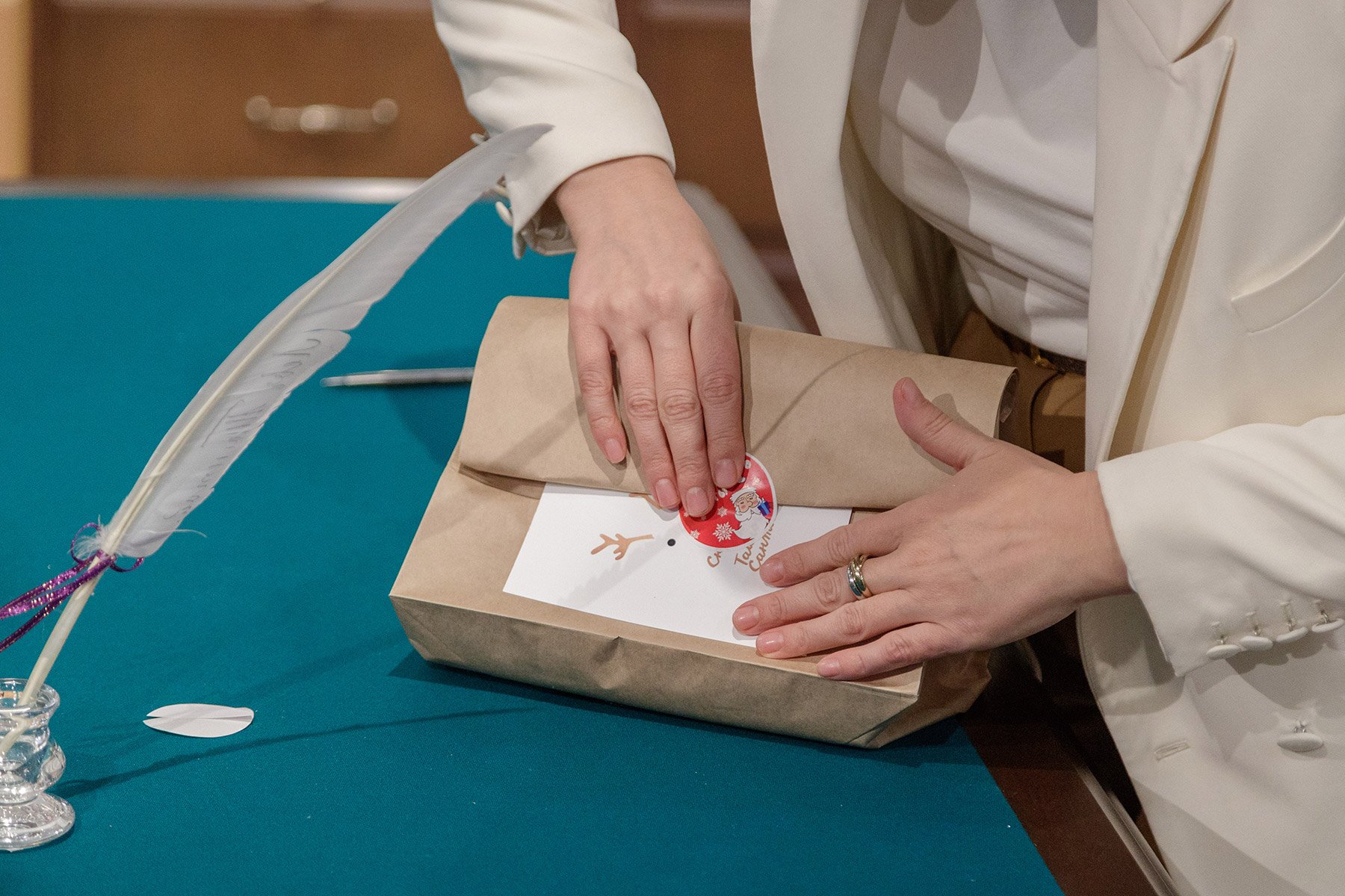 Одной из первых в «Тайном Санте» приняла участие председатель комитета Тульской области по развитию туризма Лариса Соломатина. Свой подарок она под елкой в пространстве «Л.Н.Т».