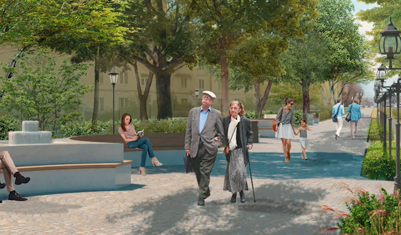 Команда архитекторов предлагает сформировать необходимое количество мест отдыха и общественных пространств на всем протяжении улицы. Все эти меры позволят превратить улицу в полноценное прогулочное пространство: для этого мало сделать тротуары — необходимо провести озеленение и разместить объекты для отдыха.
