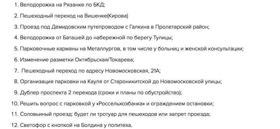Также общественники представили тульским властям список вопросов и получили ответ на часть из них. Остальные находятся на стадии проработки. Среди них велодорожка на Рязанской улице, от Баташей до набережной на берегу Тулицы, парковочные карманы на Металлургов, парковка на улице Кауля, а также дублер проспекта Ленина второго перехода.
