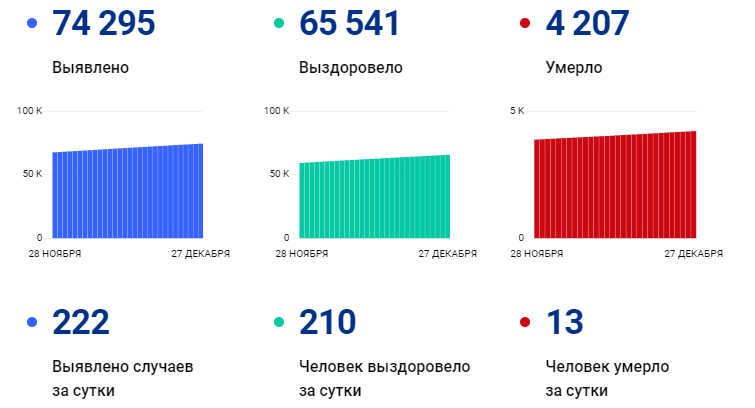 За последние сутки в Тульской области зарегистрировали 222 новых случаев коронавируса. Об этом 27 декабря сообщили в федеральном оперативном штабе. С учетом обновленных данных общее число заболевших в регионе достигло показателя в 74 295 с начала пандемии.