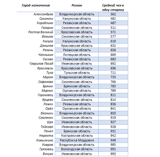 Так, из Москвы в Тулу в среднем можно добраться за 711 рублей. Самые дешевые билеты из столицы России до города Александров Владимирской области. Они в среднем обойдутся путешественникам в 352 рубля. За 481 рубль можно добраться до Калужской области Сухиничи. Поездка до Кораблина Рязанской области обойдется на 6 рублей дороже — 487 рублей.