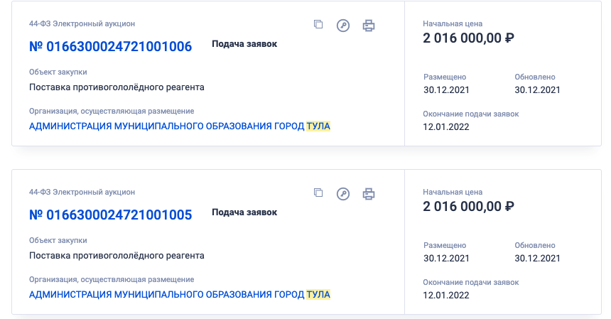 Выигравший в электронном аукционе поставщик должен обеспечивать город реагентами в течение 2022 года — партиями по заявке заказчика. Место доставки — склад на улице Чмутова в Туле.