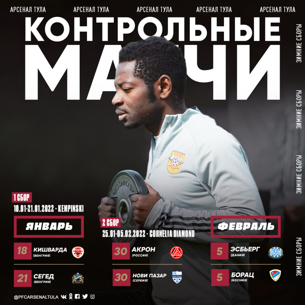 30 января «Арсенал» проведет сразу два матча: против российского «Акрона» и сербского «Нови Пазар». Завершатся контрольные встречи двумя играми 5 февраля. Оружейники проведут матчи против «Эсбьерга» из Дании и боснийского «Бораца».