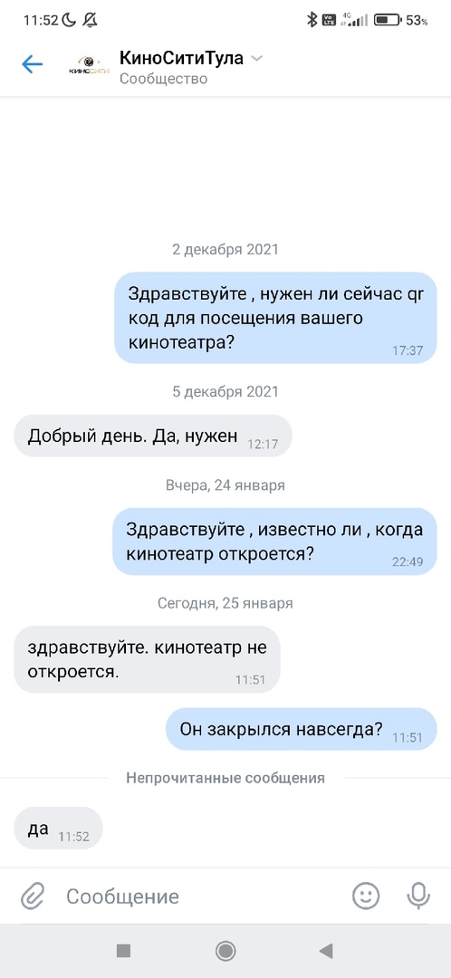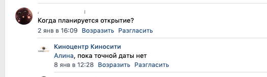 Отметим, что в паблике «КиноСити Тула» распространяют скриншот переписки, из которой следует, что кинотеатр не откроется и вовсе.