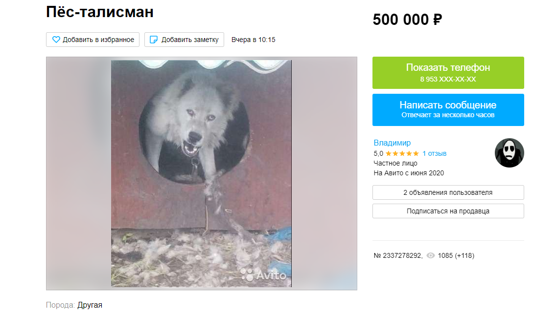 «Собака станет очень хорошим талисманом и знаком удачи для каждого человека,ведь такой будет только у вас. Пёс очень ухоженный, ну а каждый уважаемый себя мужчина обязан иметь такую собаку», — говорится в объявлении.
