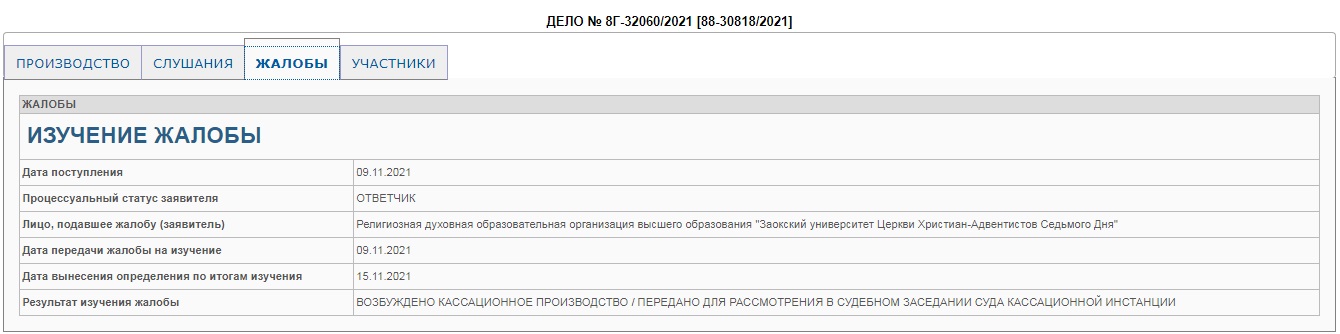Снести самострой адвентисты должны были в течение двух месяцев. Однако и они не согласились с решением Тульского областного суда: в ноябре 2021 года руководство университета Церкви Христиан-Адвентистов Седьмого Дня в лице ректора Бориса Геннадьевича Протасевича подало жалобу в Первый кассационный суд общей юрисдикции. Он заявил о нарушении норм материального права – «несоответствии выводов апелляционной инстанции фактическим обстоятельствам дела и нарушении норм процессуального права в части неизвещения о рассмотрении апелляционной жалобы».