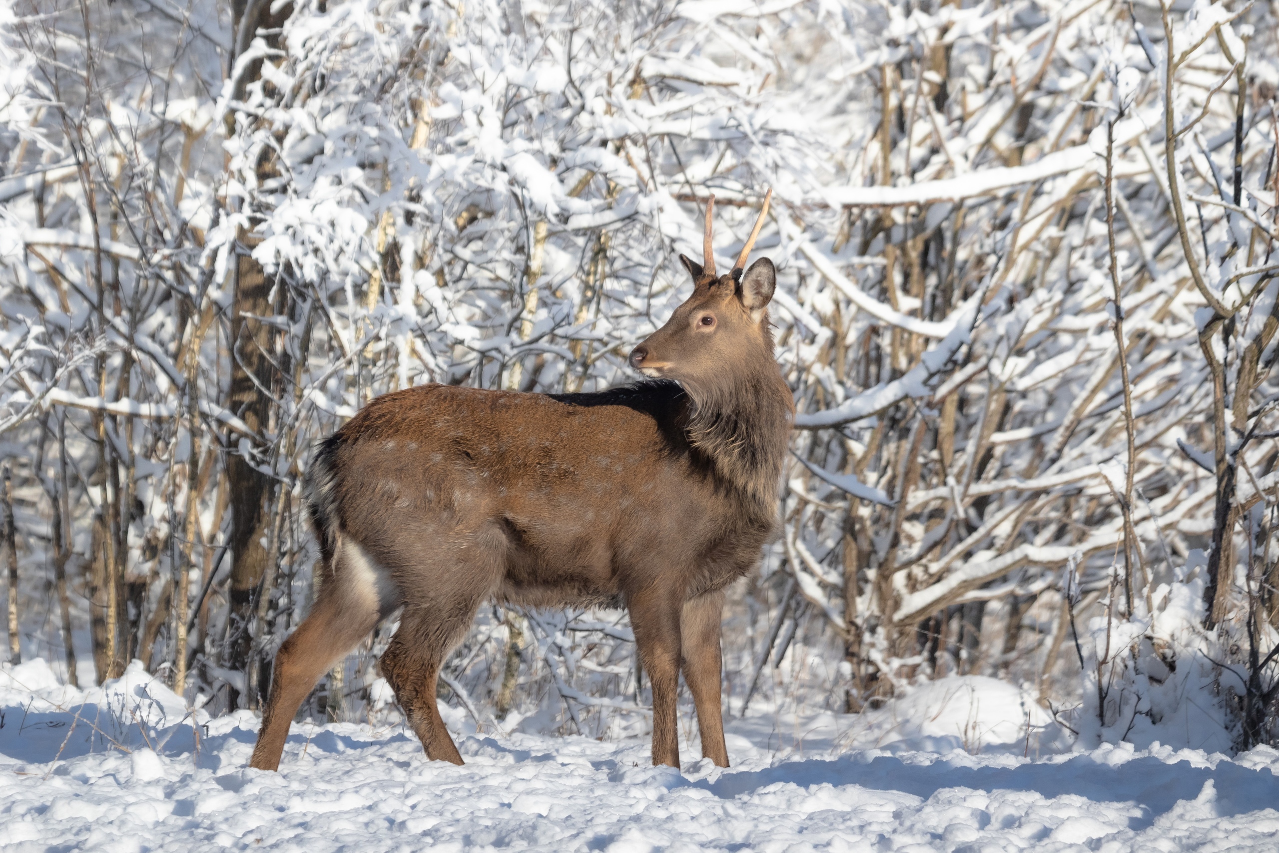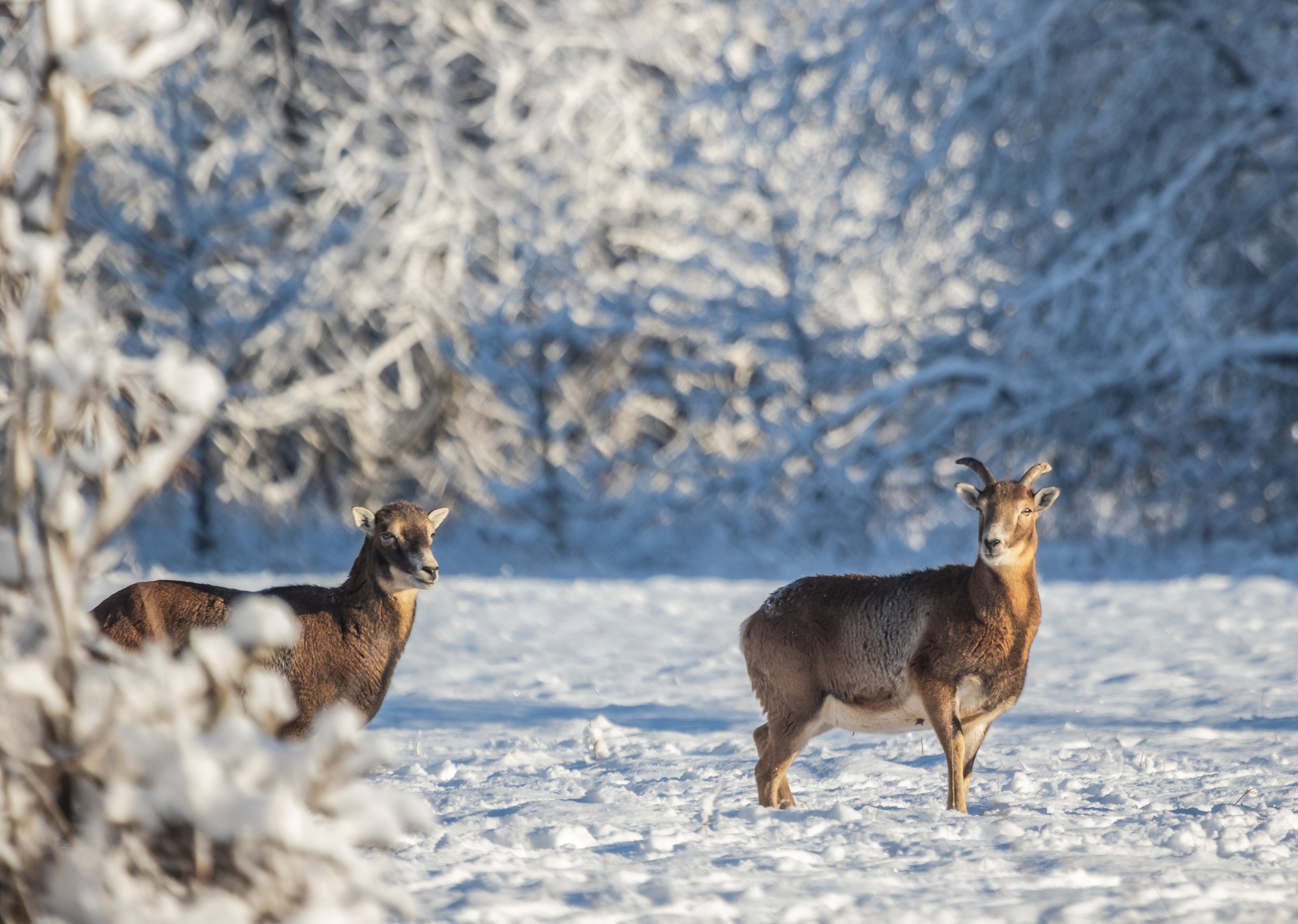 Этой зимой фотографу также удалось запечатлеть пару молодых муфлонов. Это ближайшие родственники диких овец, которых нередко путают с козлами. Главным отличием муфлонов являются крупные загнутые рога. Чем старше самец, тем рога длиннее и сильнее завиваются.