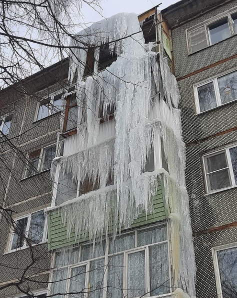 Здесь сосульки не только свисают с крыши, но и полностью закрыли балкон. Вместо окон у жильцов — ледяная стена, которая уже перебирается на нижний козырек.