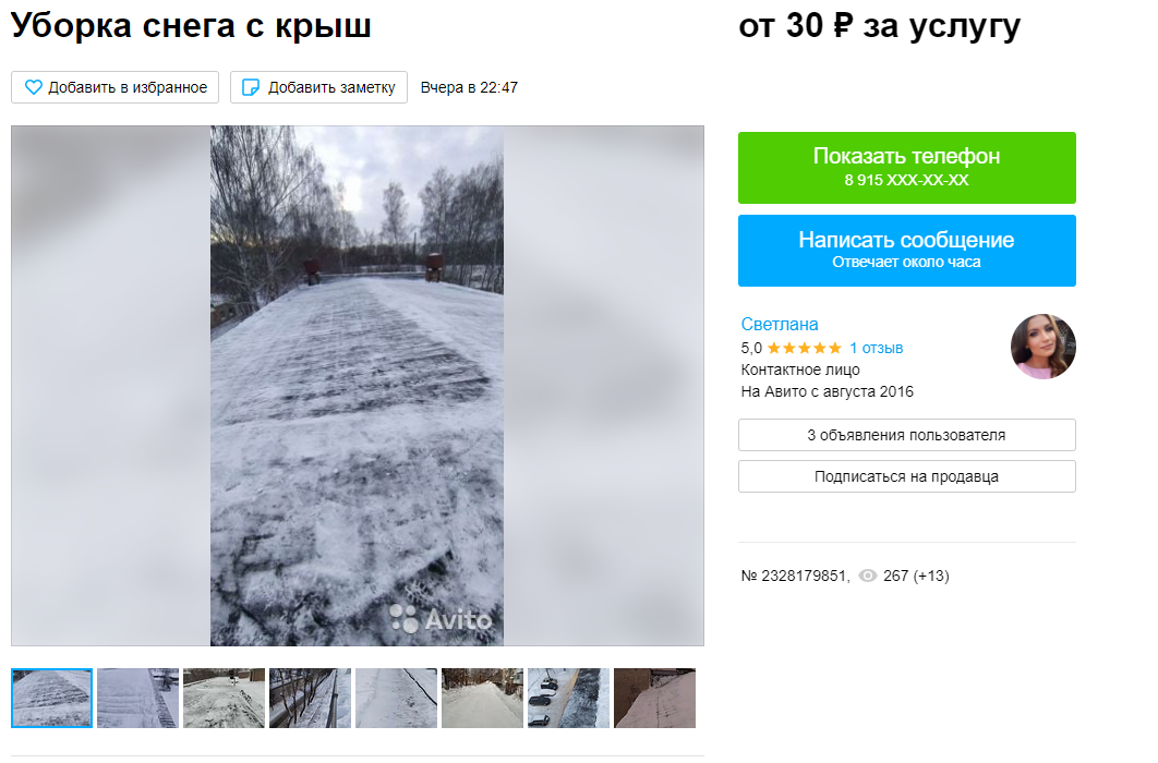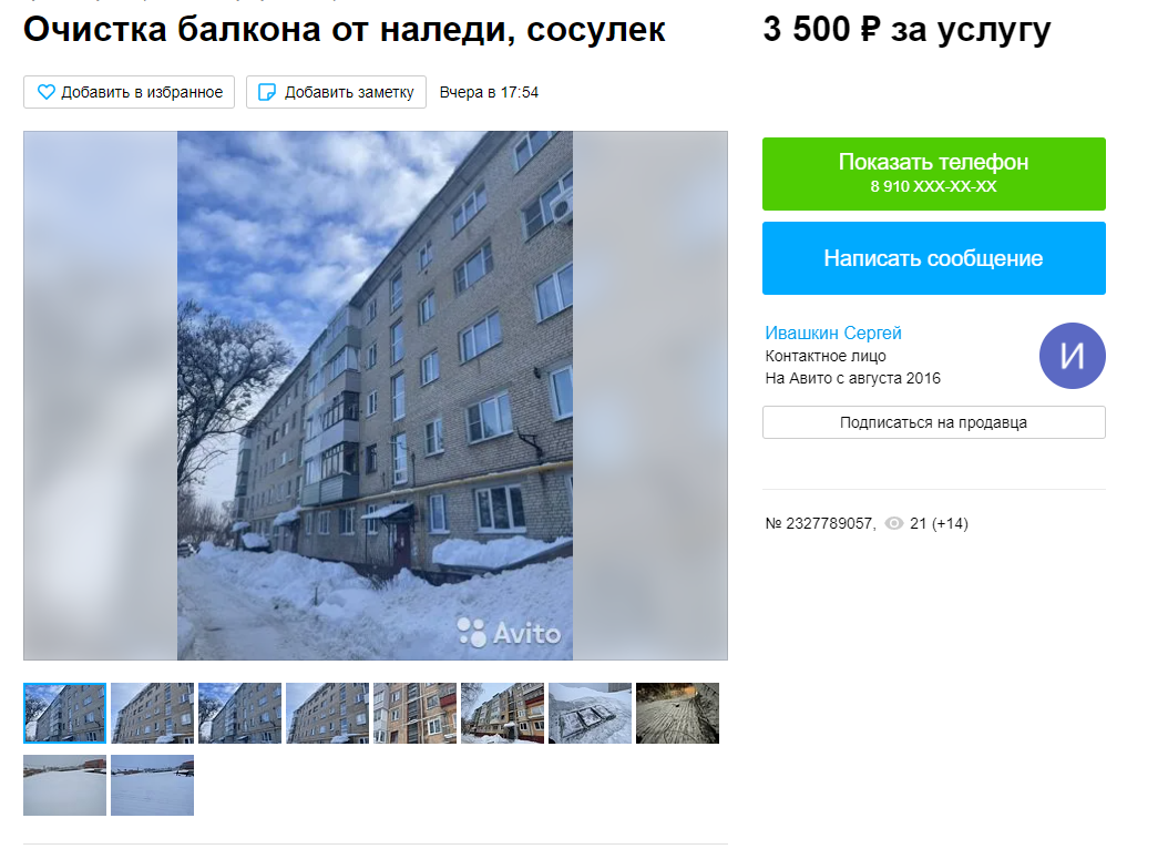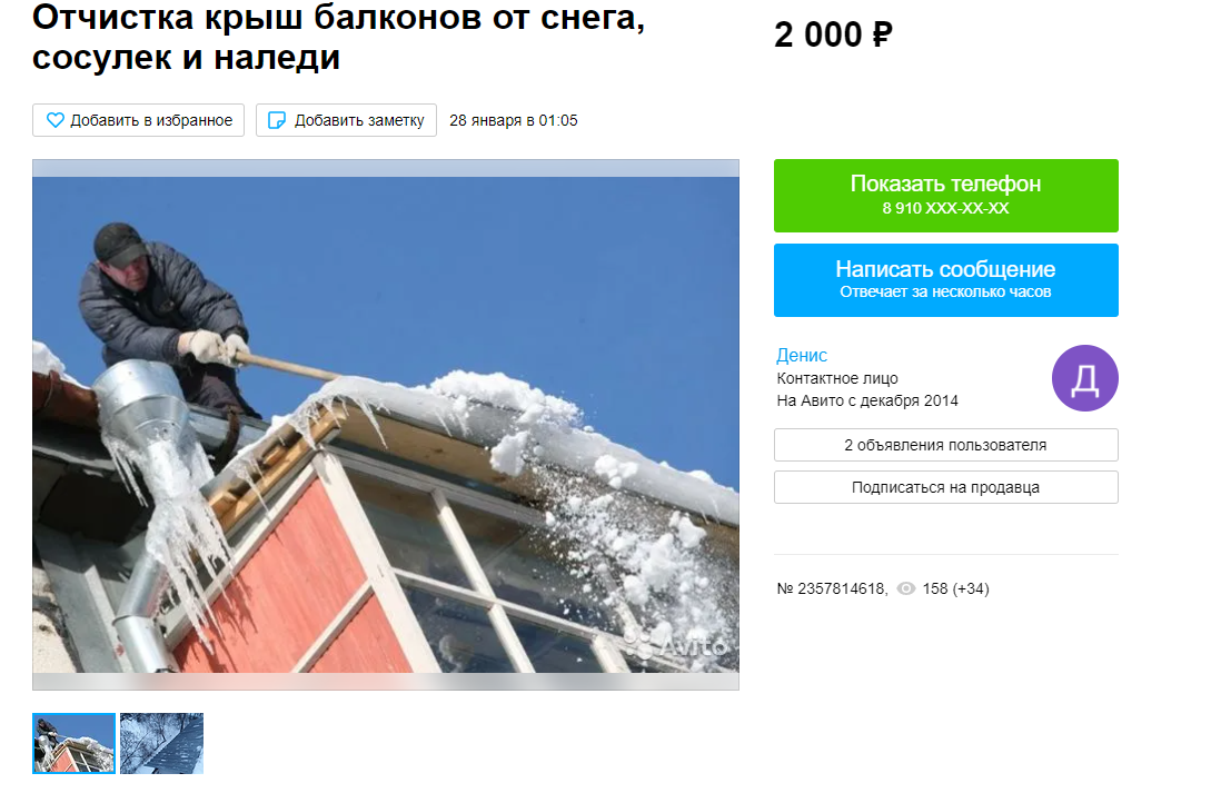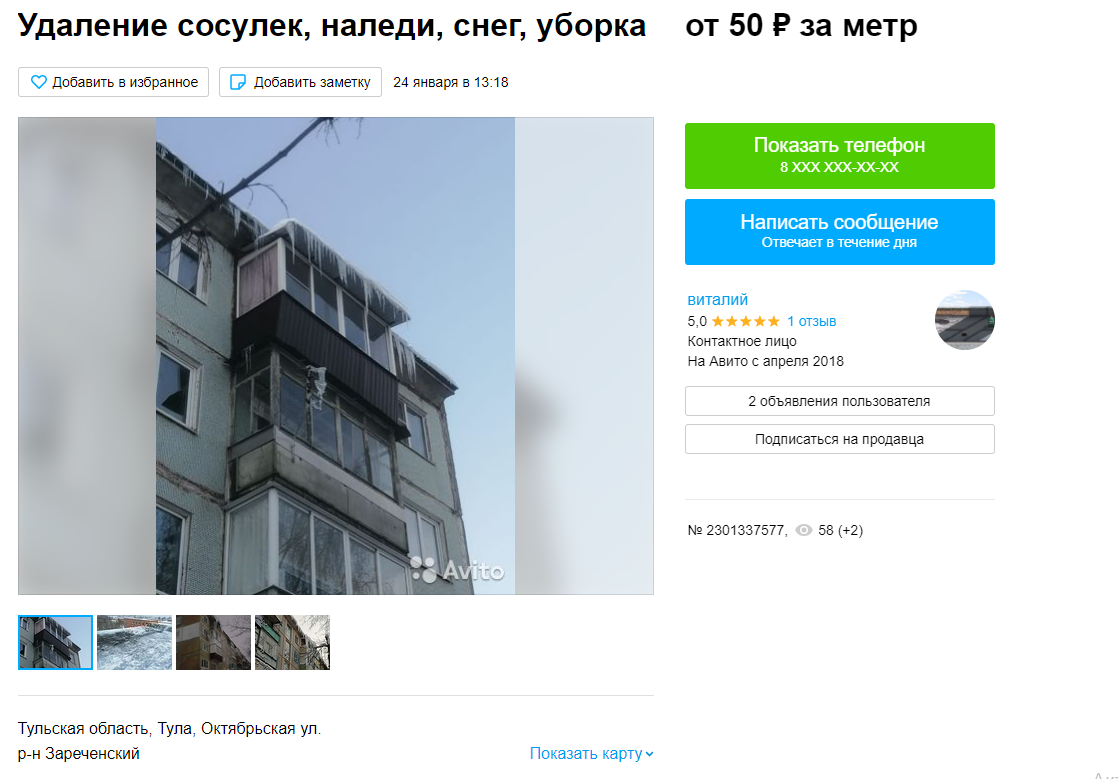 Еще один продавец из Тулы предлагает очистить от снега крышу, а также балконы от сосулек и наледи всего за 3 500 рублей. В объявлении отмечается, что бригада работает по всему региону, поэтому обращаться за помощью могут не только жители областного центра.