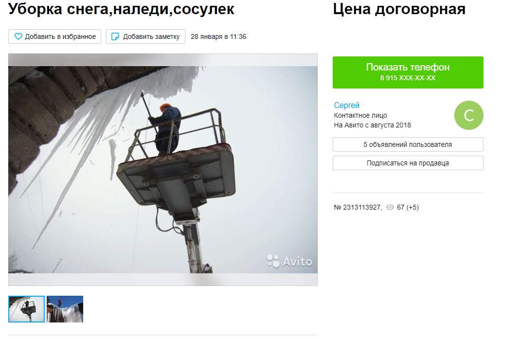 В городе также предлагают расчистить крыши от снега и сосулек с помощью вышки. Стоимость работ договорная. Продавец принимает наличные и безнал.