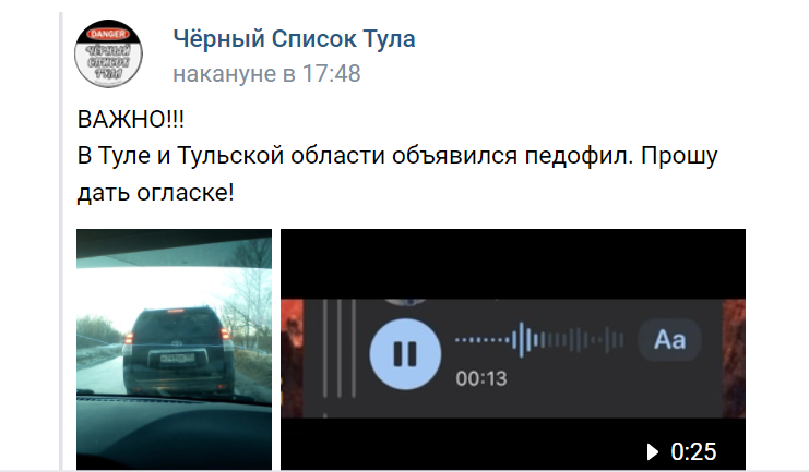 Вечером 23 февраля в социальных сетях появился пост о возможном появлении педофила в киреевских Липках. По словам автора, некий автомобилист ездил по городу и делал фотографии маленьких девочек, а после и вовсе повел себя агрессивно.
