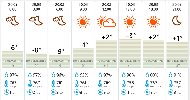 Ветер западный до 5 м/с. Осадков не ожидается. Атмосферное давление днем заметно выше нормы — до 761 мм рт. ст. Метеозависимым следует позаботиться о своем здоровье.