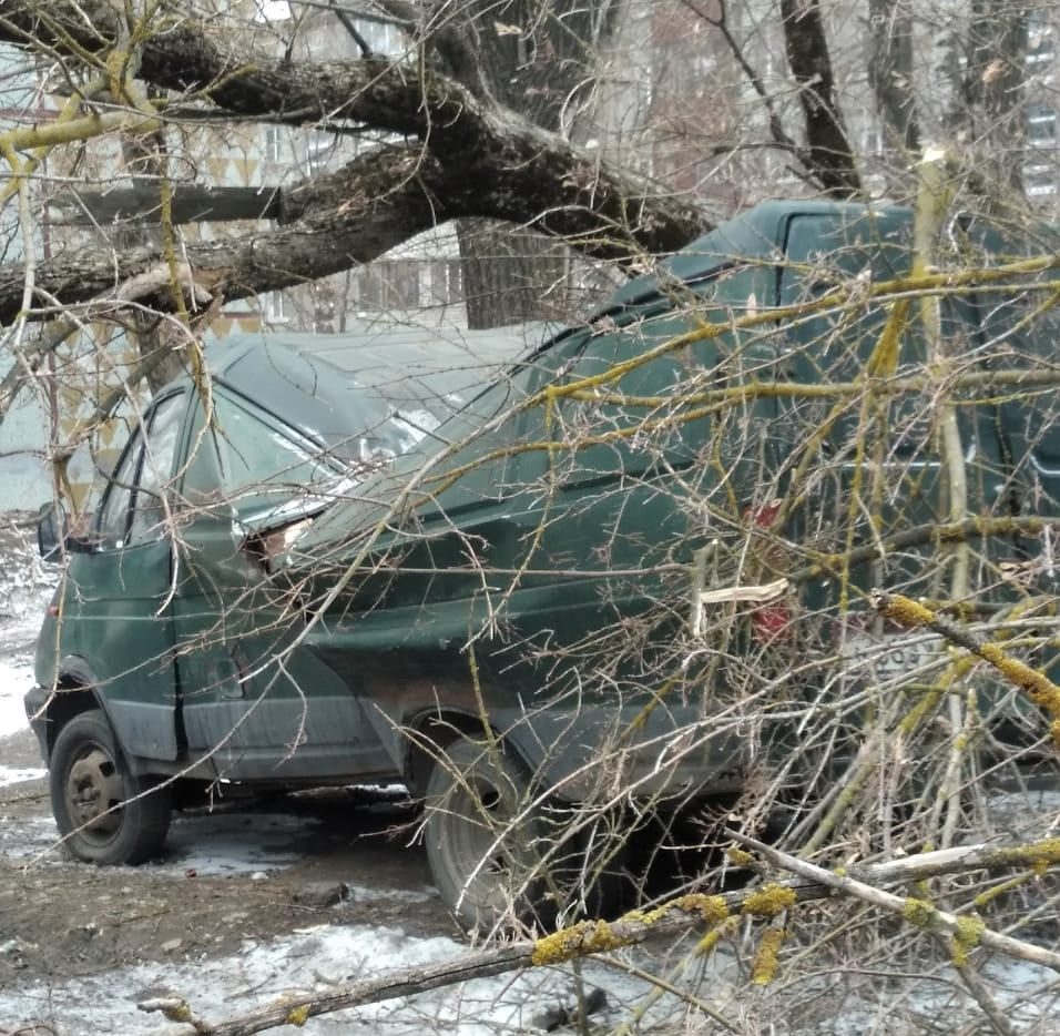 В Туле во дворе многоквартирного дома на улице Калинина упавшее дерево повредило два автомобиля — «Волгу» и «Газель». Произошло ЧП в воскресенье днем, 27 марта; фотографии с места происшествия опубликовали в социальных сетях.
