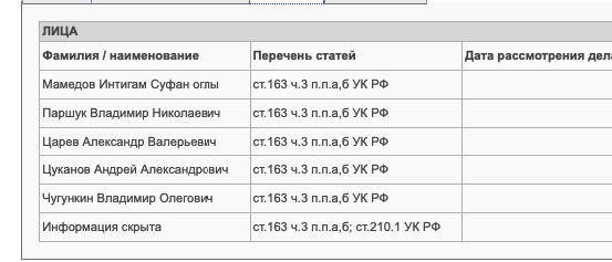 На скамье подсудимых оказались шесть человек. Интигам Мамедов, Владимир Паршук, Александр Царев, Андрей Цуканов и Владимир Чугункин обвинялись в вымогательстве, шестому участнику процесса — Юрию Кушникову, по нашей информации, также вменяли занятие высшего положения в преступной иерархии.
