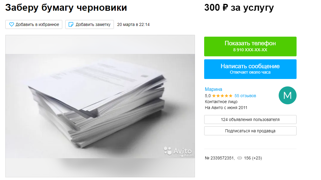 В другом объявлении цена в два раза дешевле — 300 рублей. Здесь продавец не отдает использованную бумагу, а наоборот, хочет ее забрать за эту цену.