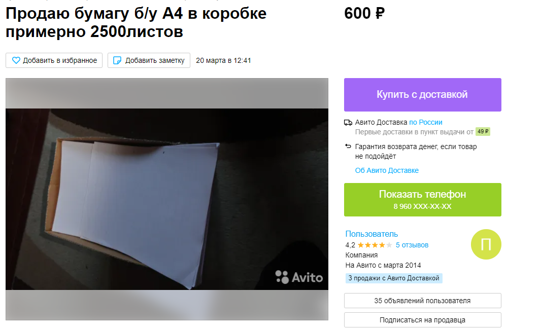 «Продаю бумагу А4 б/у. С одной стороны чистая с другой — напечатанная! Я сам на такой бумаге печатаю листовки для расклейки», — пишет автор.