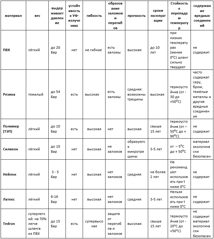 Сравнительные характеристики шлангов в зависимости от материала изготовления: