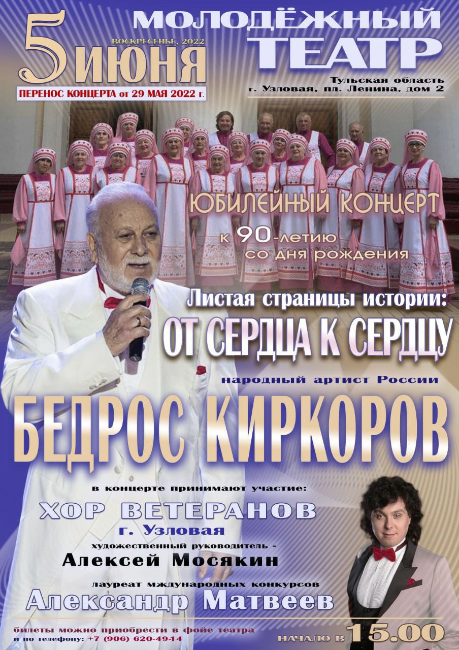 Концерт Бедроса Киркорова в Узловой (6+) перенесся на 5 июня из-за плохого самочувствия артиста. Выступление в Молодежном театре приурочено к 90-летнему юбилею певца и изначально планировалось на 29 мая, однако проблемы со здоровьем внесли свои коррективы.