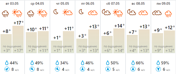 С четверга начнет теплеть — возможно до +17 градусов, но уже ко Дню Победы в Тульскую и соседнюю области придут дожди и новая волна холода. В воскресенье, 8 мая, в зоне фронтальной системы, прошумят интенсивные ливни, ночью +6…+11, днем +12…+17. Под утро 9 мая воздух остынет до +3…+8 градусов, в дневные часы только +9…+14 (ниже нормы на пять градусов). Прохладно будет и 10 мая.