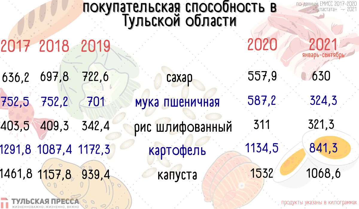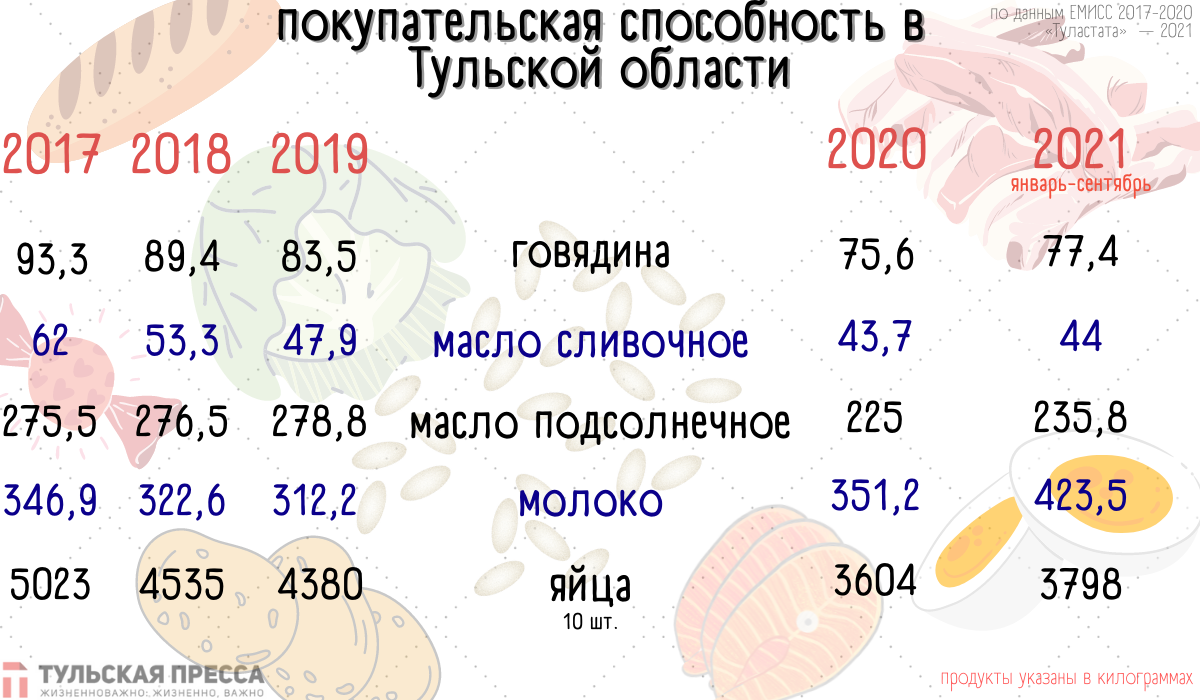 По данным Росстата, с 2017 по 2020 года покупательская способность у жителей Тульской области падала. Так, если в 2017 году на среднюю зарплату можно было купить 93,3 килограмма говядины на кости, то уже в 2020 году — 75,6 килограмма. Аналогичная ситуация наблюдается и с другими продуктами. Например, пять лет назад на тульскую зарплату можно было взять больше 5 тыс. упаковок яиц по 10 штук, то в 2020-м — 3604 десятка.