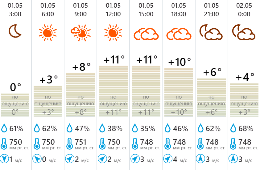 Ночью температура опустится до +4 градусов, без осадков. Ветер слабый, 3 м/с, атмосферное давление 748 мм рт. ст. Влажность воздуха — 68%.